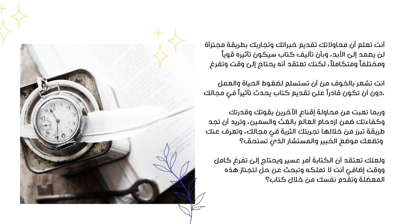 تخيل أنك ستوظف خبراتك في المكان الصحيح من خلال إنجاز كتاب تفتخر بكتابته، يحمل خبراتك وتجاربك، يلهم الآخرين ليتعلموا منك ويتعاملوا معك بكل ثقة وحماس.