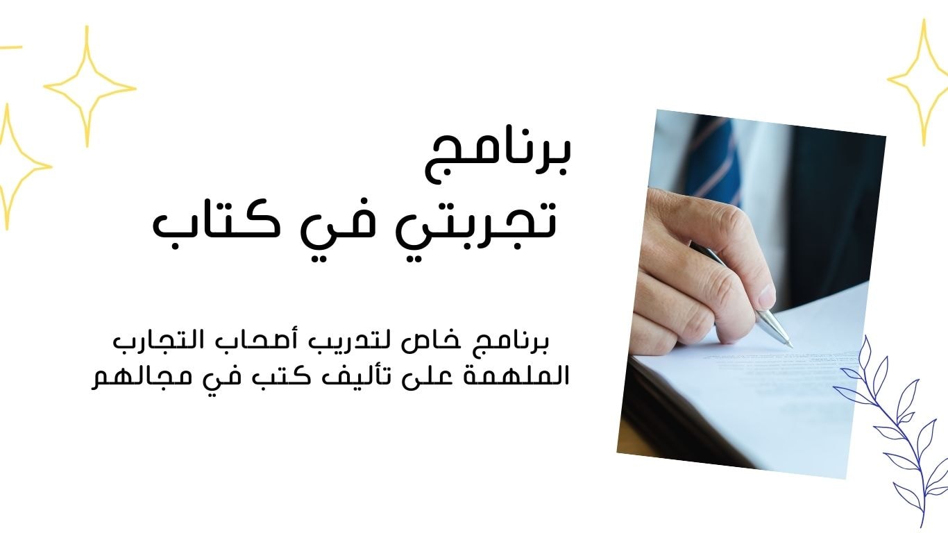 برنامج تجربتي في كتاب للأشخاص الرياديين أصحاب التجارب المميزة والمدربين والقادة والمديرين التنفيذيين والمهنيين البارعين ولأصحاب التجارب الملهمة لتمكينهم من تأليف كتاب تجربة آو أعمال خاص يتحدث عن رحلتهم في مجالهم وذلك خلال ثلاثة أشهر، معك عبر الانترنت في كل ما تحتاج إليه من المعرفة والمشورة و كيفية التطبيق للوصول لتأليف كتاب مميز حتى وإن لم يسبق لك من قبل تأليف كتاب.